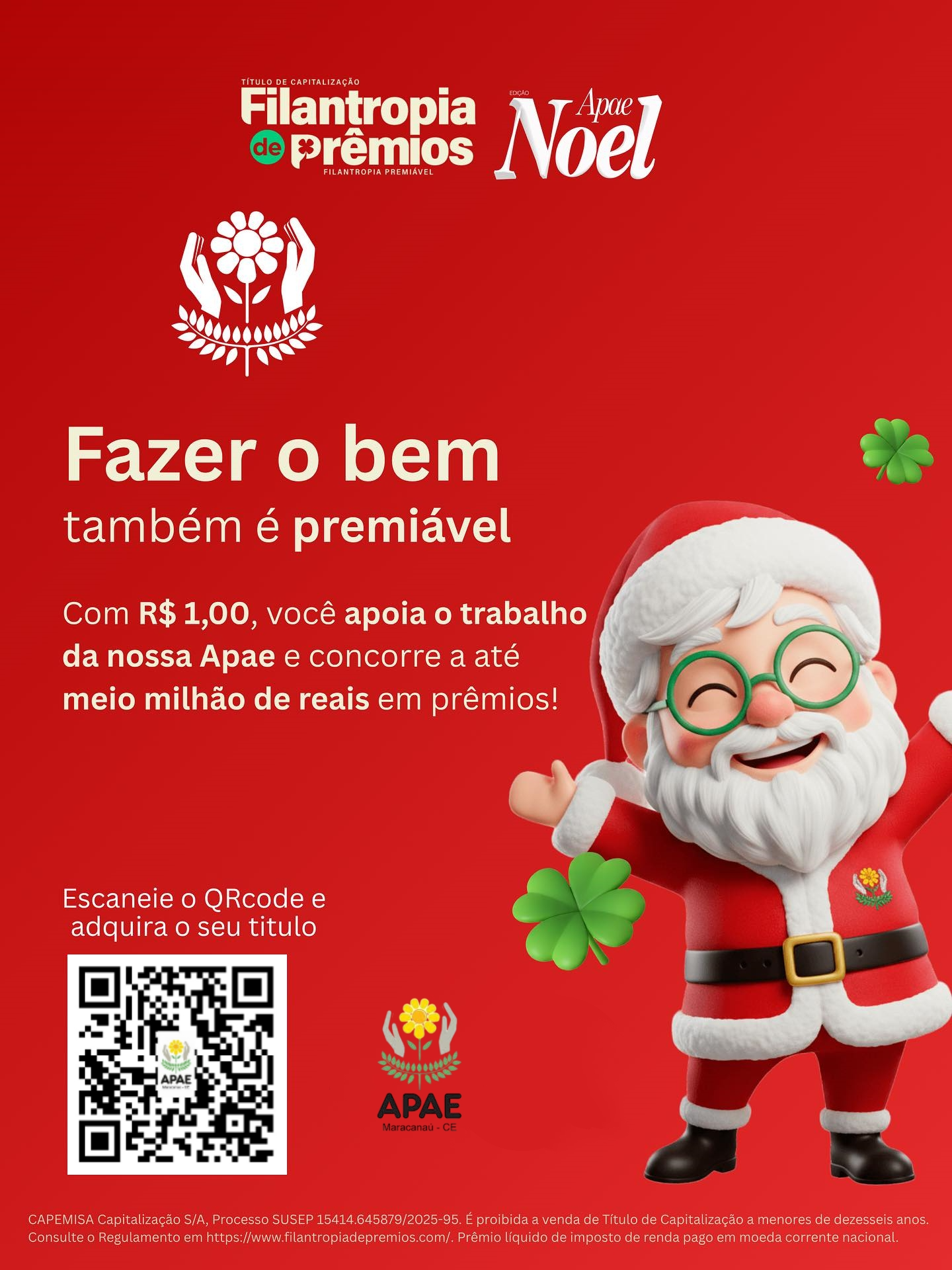 Ao participar, além de ajudar nossa Apae, ainda concorre a *R$ 200* na hora e o melhor: segue concorrendo aos prêmios principais de R$ 20 mil e R$ 300 mil! 😍
